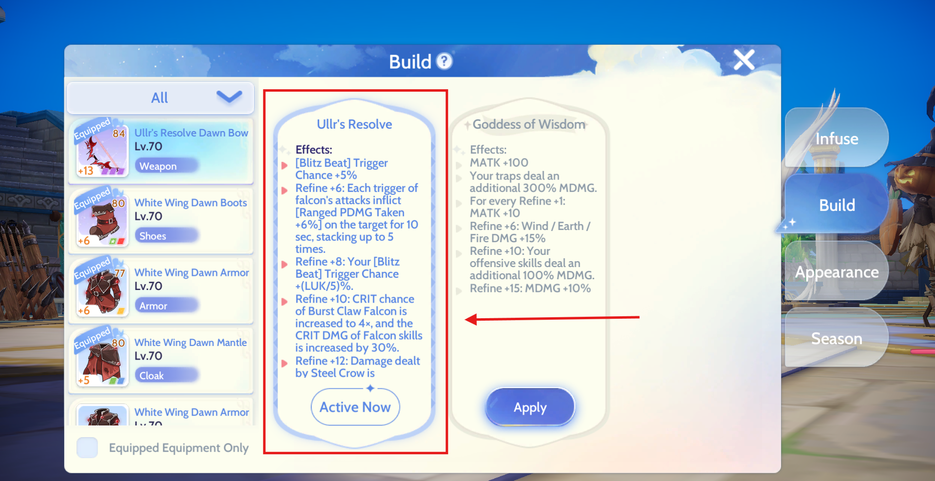 Endgame Scaling: If you can push Ullr's Resolve to Refine +12, your Falcon damage will additionally benefit from 40% of your Physical Damage bonuses (including Race, Size, and Element modifiers).