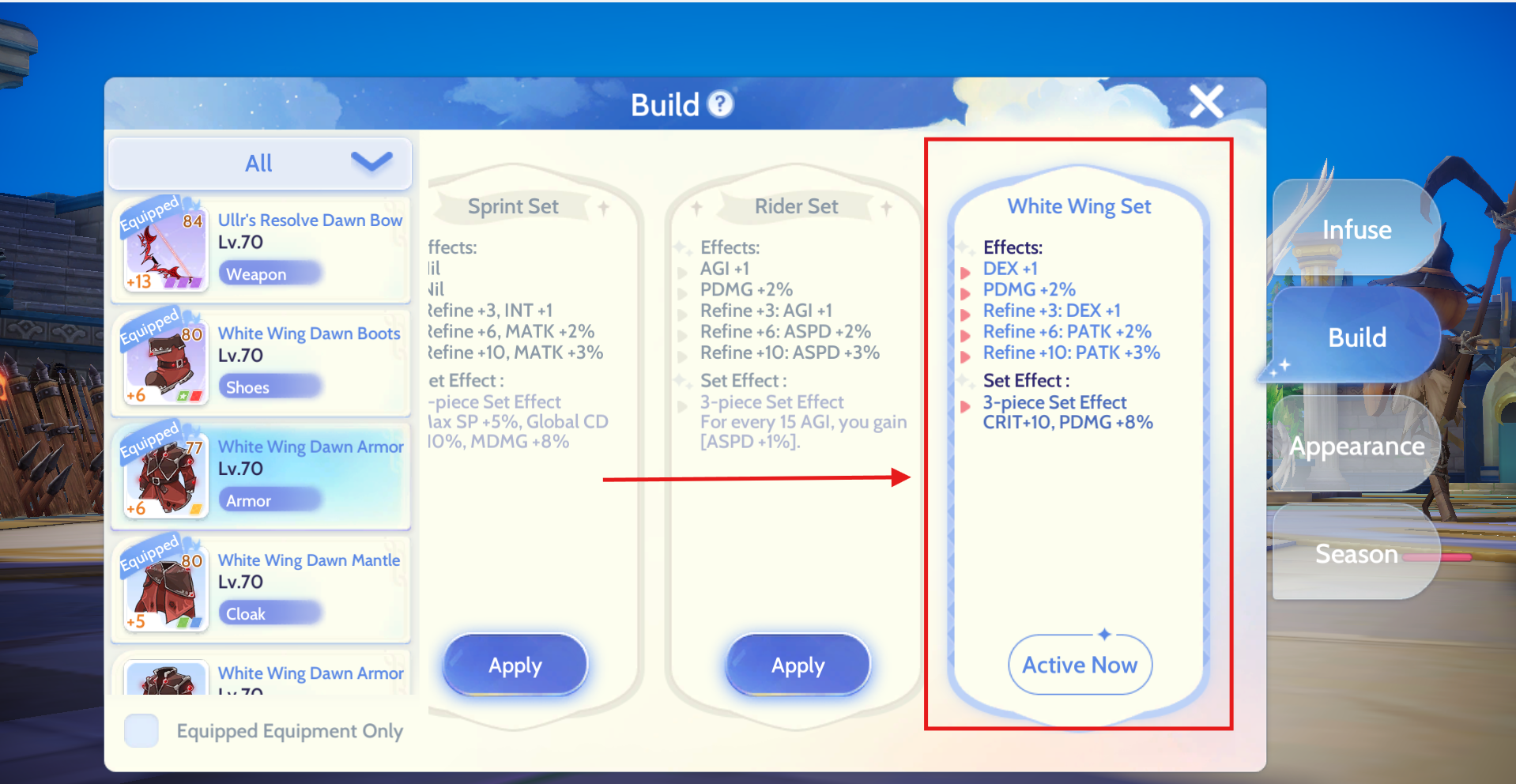 Armor: Use the White Wing Set special build for an extra +10 Crit.
