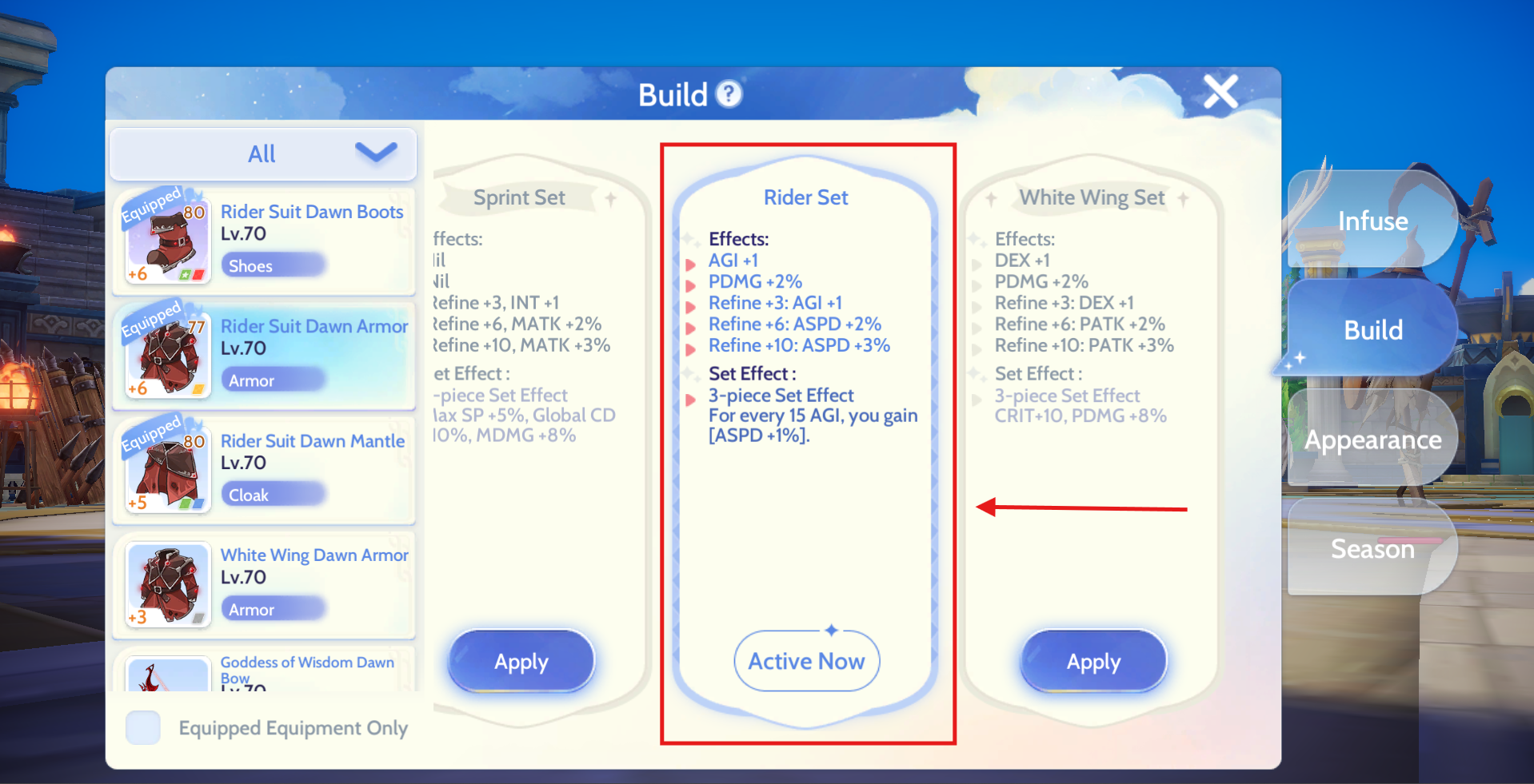 Gear: Use the Rider Set (Cloak and Armor). Refining both to +10 grants bonus ASPD.